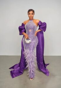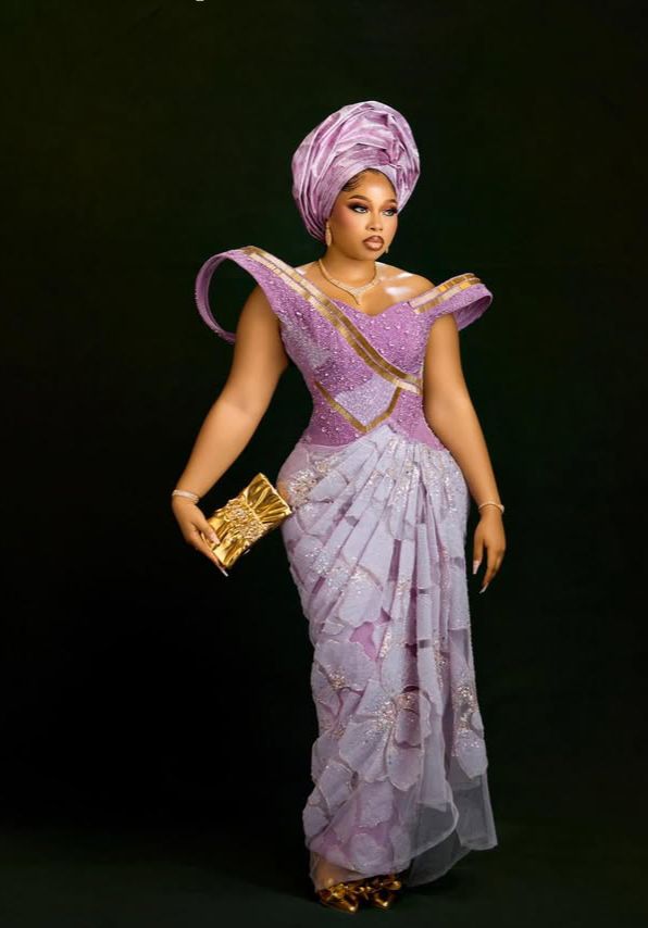If you love timeless aso-ebi, this purple lace dress is a beauty. With its delicate sheer sleeves and detailed corset bodice, the style balances elegance and tradition effortlessly. Simple yet deeply sophisticated.