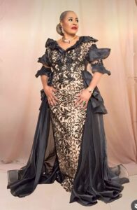Nothing speaks elegance like black and gold. This gown features dramatic ruffled sleeves paired with a richly embroidered fabric. It’s the kind of look that announces sophistication the moment you walk into the room—ideal for mature, classy women who love timeless beauty.