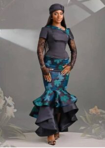 For lovers of contemporary African fashion, this teal and black peplum set is a show-stopper. The lace sleeves and asymmetric layered hem add movement and uniqueness. Stylish, confident, and refreshingly modern.