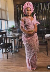 A stunning fusion of pink lace and silver wrapper, accessorized with a perfectly tied gele. The fitted bodice, sheer details, and soft colour palette make it feminine and elegant. A perfect choice for weddings and cultural celebrations.
