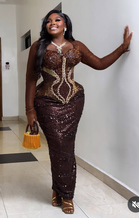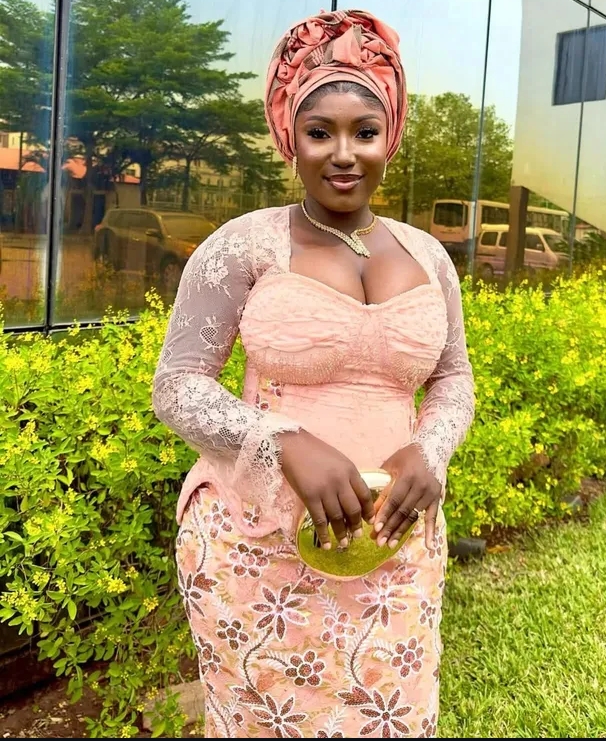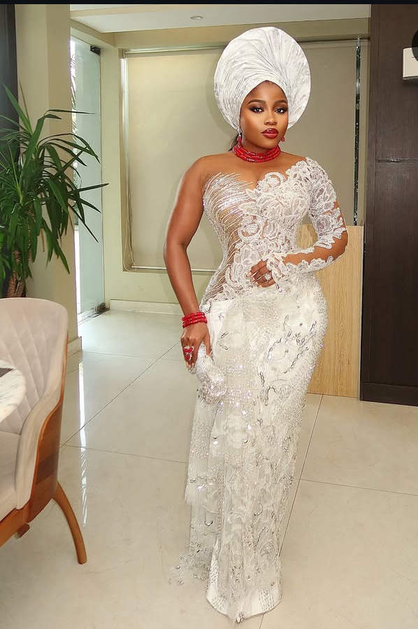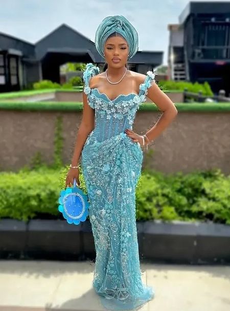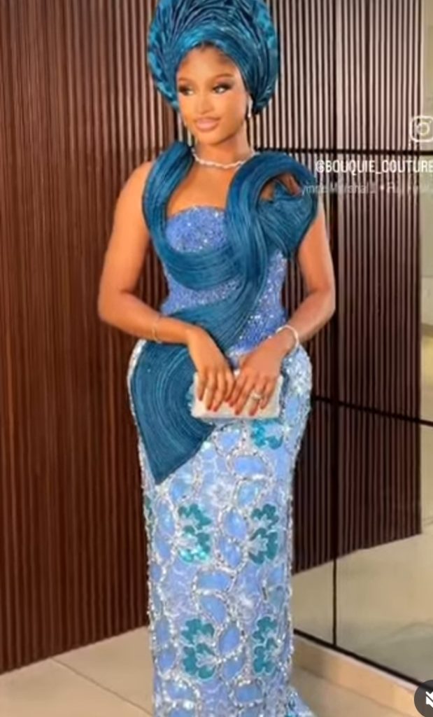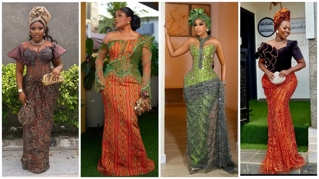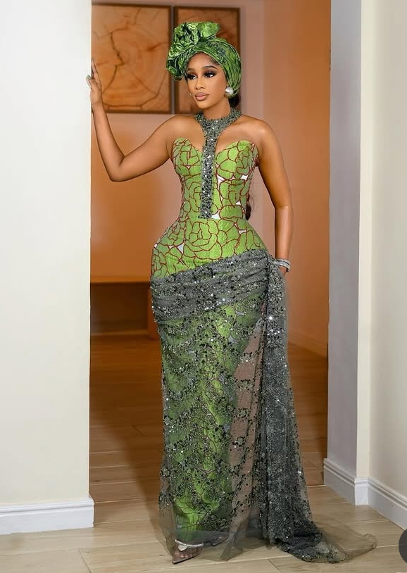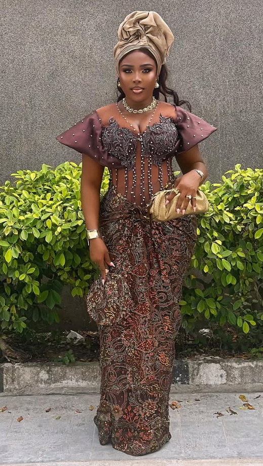 The first outfit features a detailed corset bodice with ornate embellishments and delicate lace patterns. Perfectly paired with a wrapper-style skirt, it balances modern fashion with cultural identity. The nude illusion and metallic details make it both modest and trendy — ideal for church thanksgiving or traditional weddings.