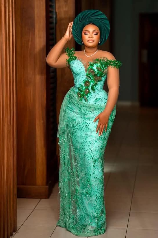 The third look screams glam with a fitted bodice and sequin-styled net overlay. The blend of vibrant green and silver sparkle creates a regal aura. It’s an excellent option for high-profile occasions like church banquets or receptions.