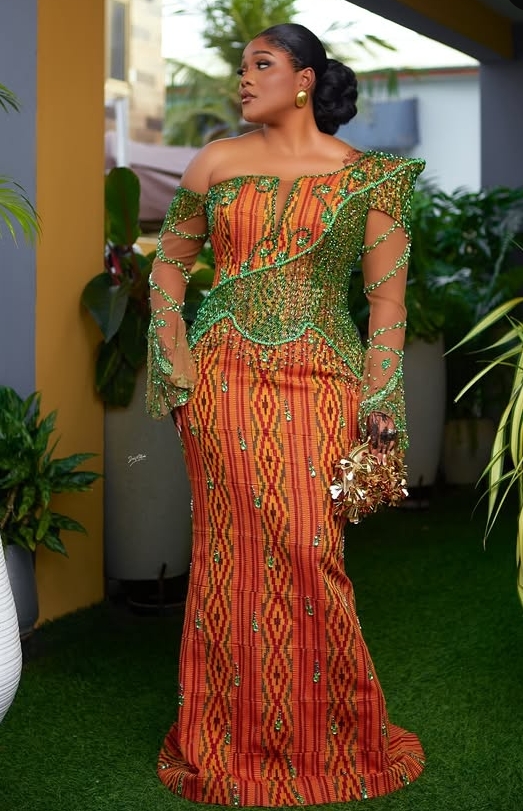 A vibrant orange kente fabric takes center stage in the second look, paired with green beadwork and layered sleeves. This ensemble is a nod to heritage, infused with a touch of contemporary design — perfect for traditional church events or engagement ceremonies.