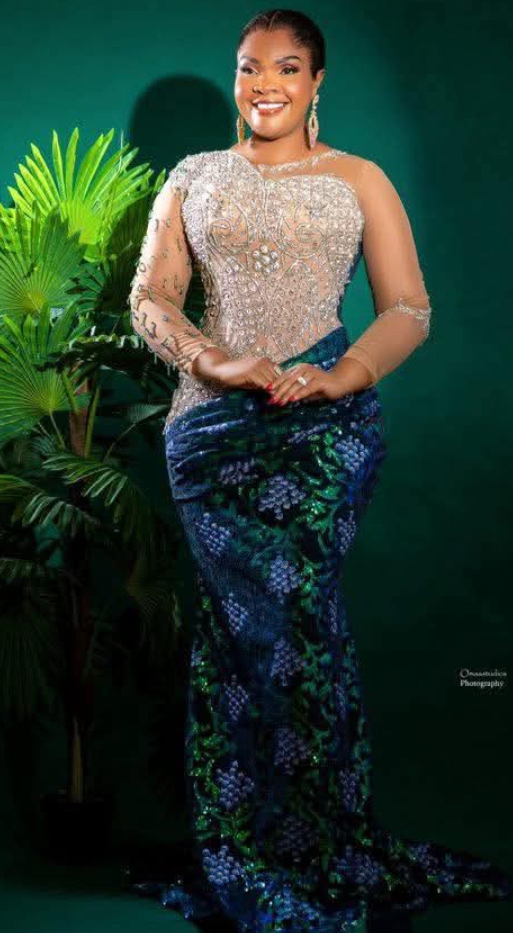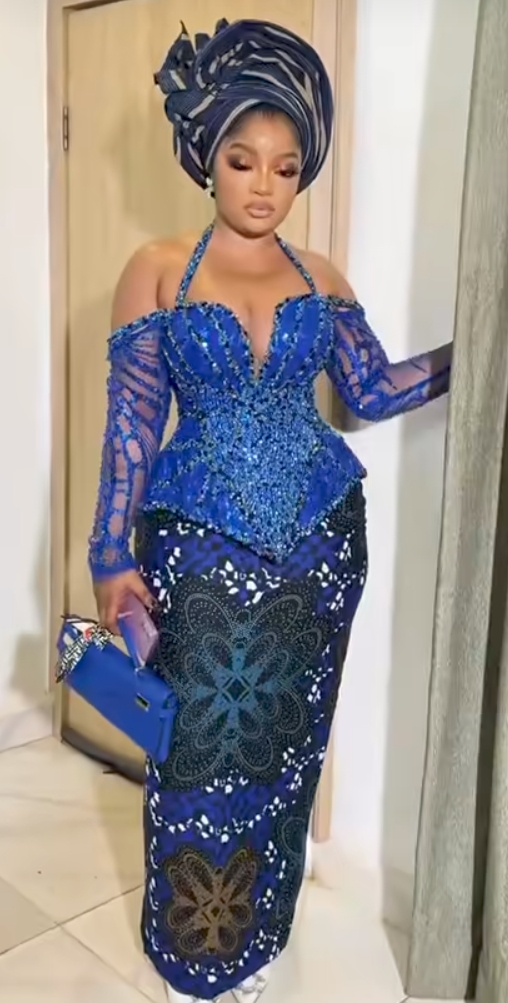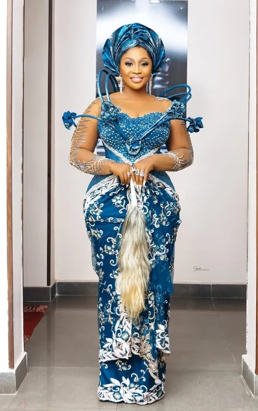 This first look redefines elegance with a royal blue beaded corset bodice paired with sheer, crystal-embellished sleeves. The fitted skirt, adorned with Ankara motifs and layered beadwork, combines traditional African prints with ultra-modern couture. The structured head wrap (gele) adds that extra touch of regal energy.