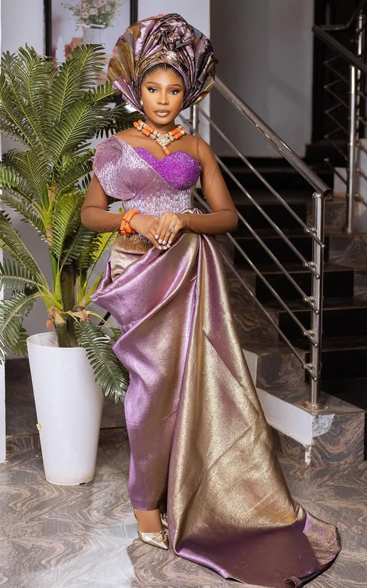Metallic Mix with Cultural Flair. This captivating style blends traditional African fabrics with modern metallic textures. The structured skirt and off-shoulder design add depth, while the multi-toned colors and coral beads give it a regal, cultural edge. Ideal for traditional weddings and high-society functions.