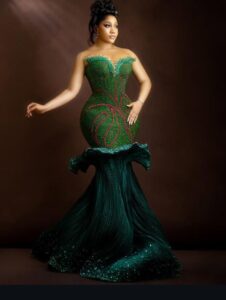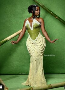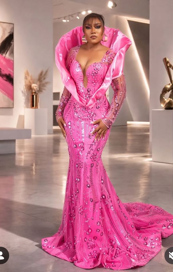 This style is a showstopper! The dramatic collar frames the face beautifully, while the fitted mermaid silhouette celebrates curves. The carefully placed embellishments sparkle from every angle, making it perfect for receptions and glamorous owambes.