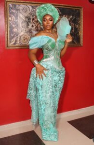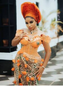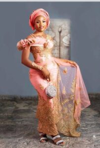 This powder-blue corset gown is simple yet enchanting. The off-shoulder neckline flatters beautifully, while the lace and beadwork add a delicate charm. Paired with a matching gele, it’s a picture-perfect choice for traditional weddings.