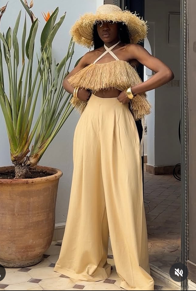 This carefree and ultra-stylish ensemble is perfect for sunny getaways, brunch dates, and outdoor hangouts. The straw-inspired top paired with flowing wide-leg trousers gives off a relaxed yet luxurious vibe. The oversized hat adds a dramatic finishing touch, making this look both playful and fashion-forward. If you love comfort that doesn’t compromise on class, this is your go-to.