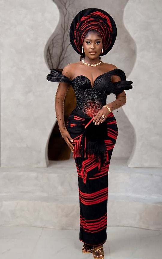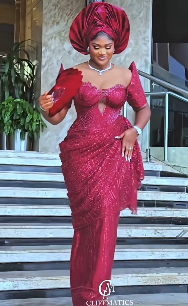 Red will always be a show-stopper, and this style proves it. The body-fitted gown is designed with intricate lace detailing and a structured bustier cut, giving it a bold yet classy vibe. Paired with a dramatic oversized gele and matching accessories, this outfit is perfect for anyone who loves to command attention at an owambe.