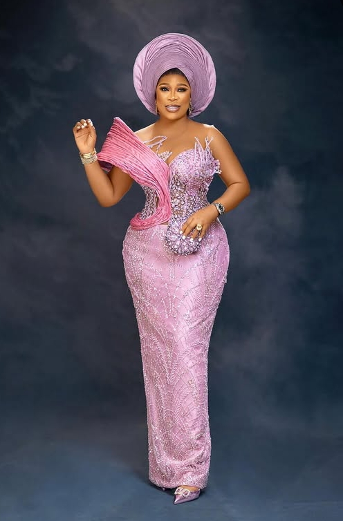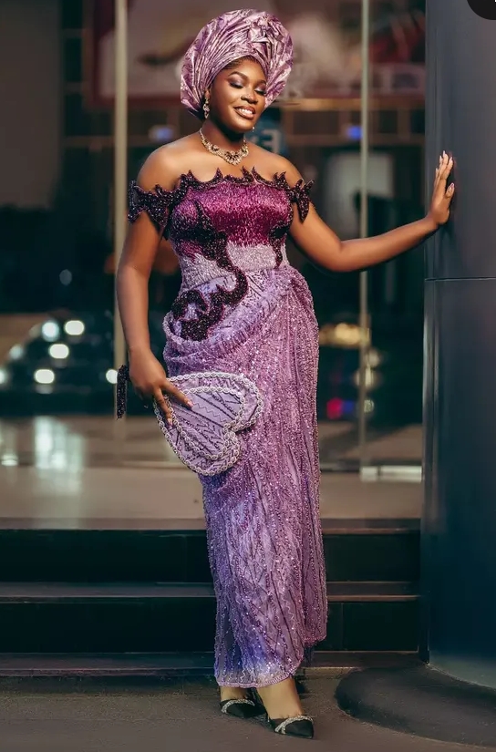 The first look features a gorgeous purple lace gown with delicate beadwork and off-shoulder sleeves. The fitted design highlights the feminine silhouette, while the matching gele (headtie) adds a touch of traditional glamour. This style is perfect for evening parties, traditional weddings, and special events where you want to exude royalty.