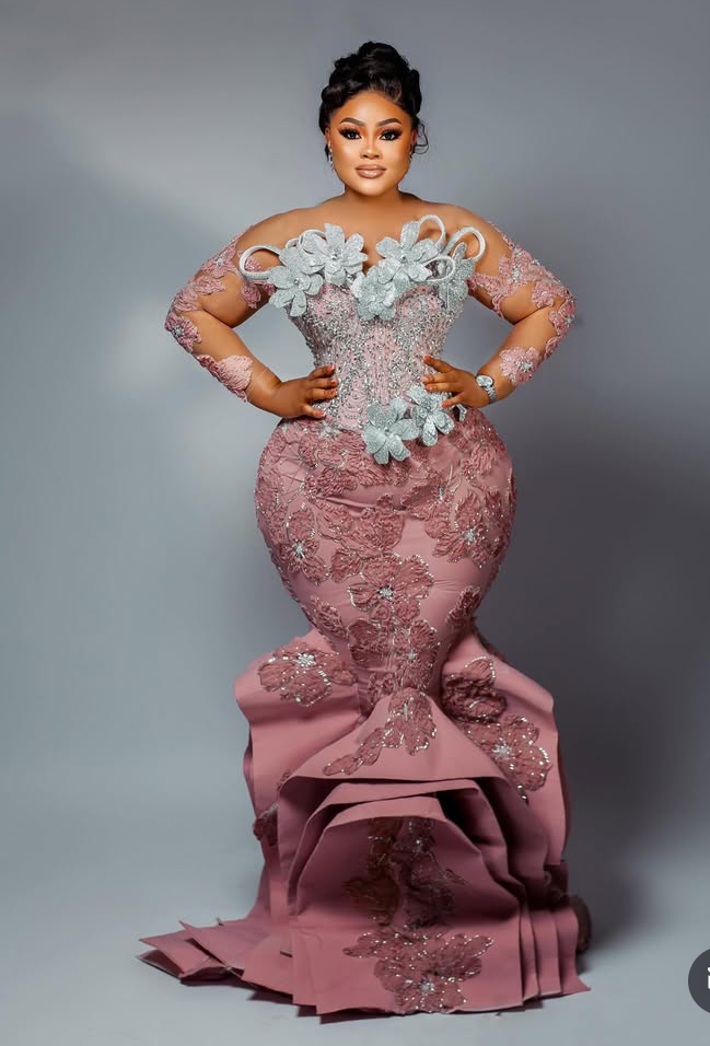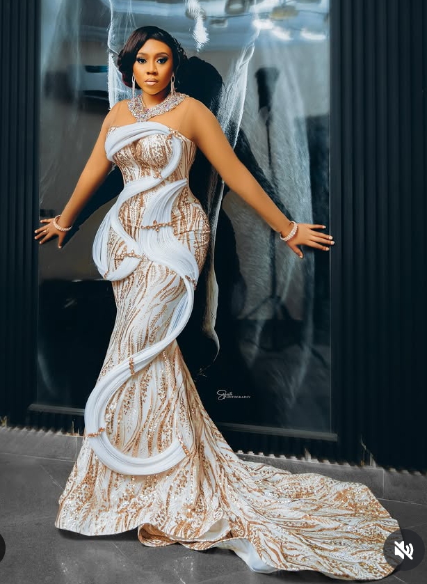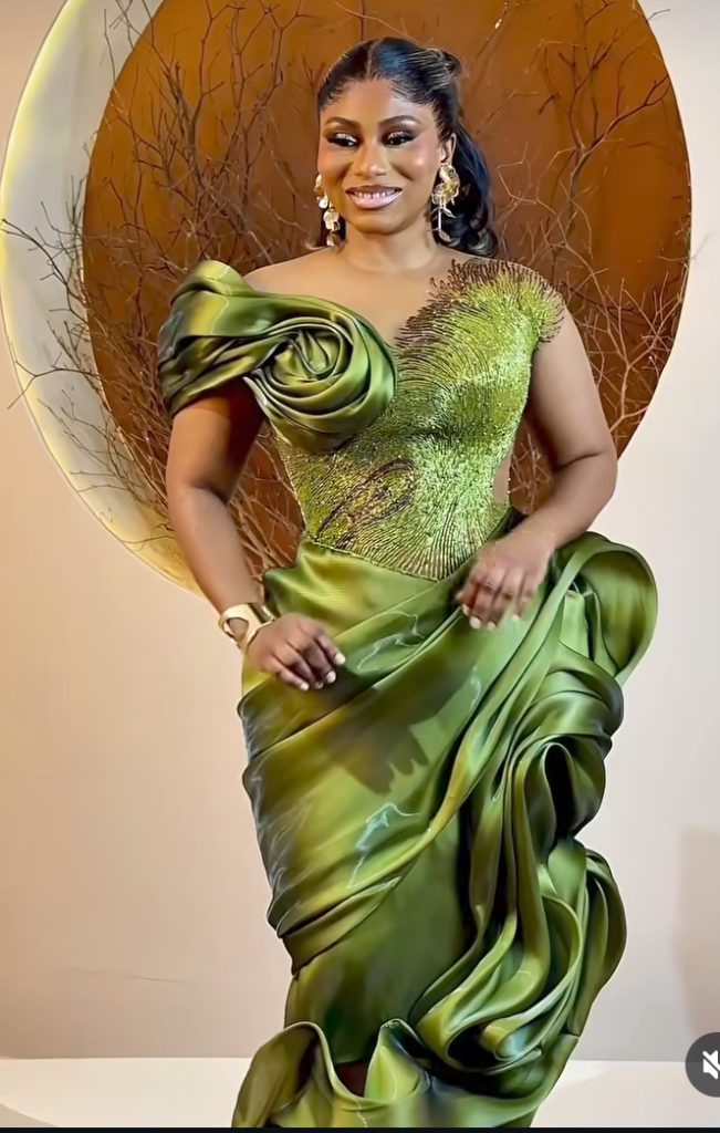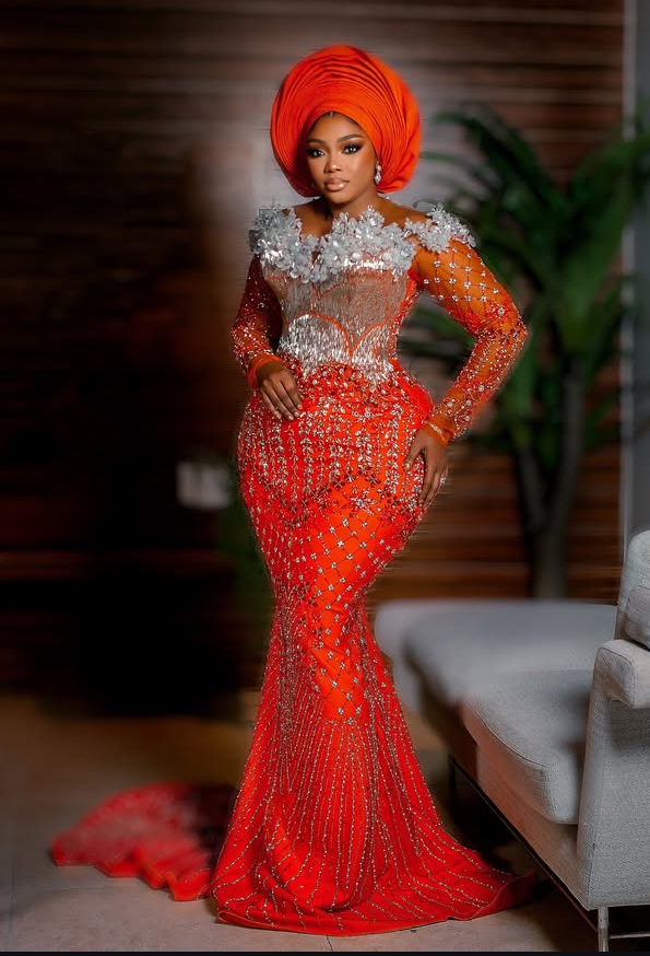 Nothing says “Owambe ready” like sparkle. Fully embellished gowns, such as the red crystal-embroidered dress and the shimmering silver gown, ensure you dazzle from every angle.