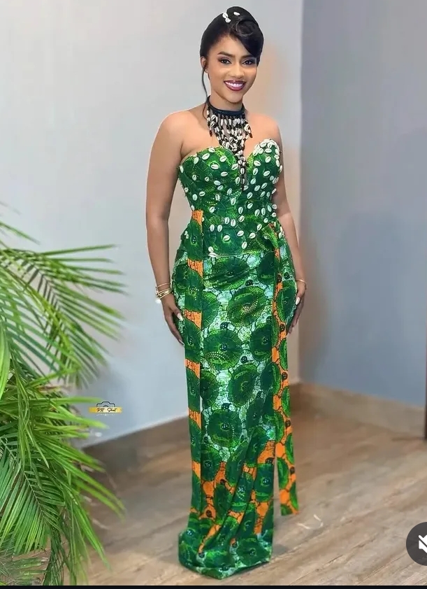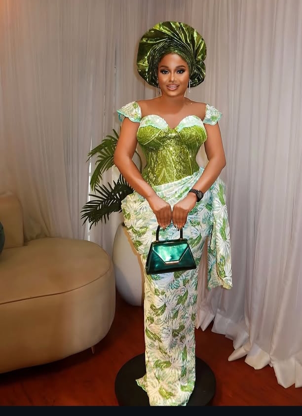 From lace to satin and Ankara blends, 2025 is the year to experiment. The green patterned fabric gown paired with matching accessories in the thumbnail showcases how mixing fabrics can create a timeless yet modern vibe.