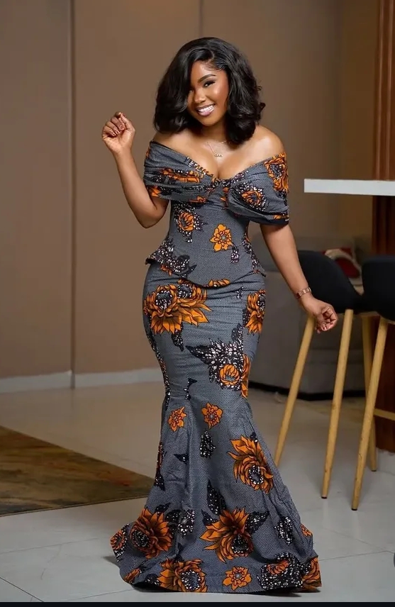 Off-shoulder Ankara gowns remain a timeless choice. They balance modesty with charm, offering a romantic and regal appeal. This style works perfectly for formal occasions and can be styled with statement earrings for a more glamorous effect.