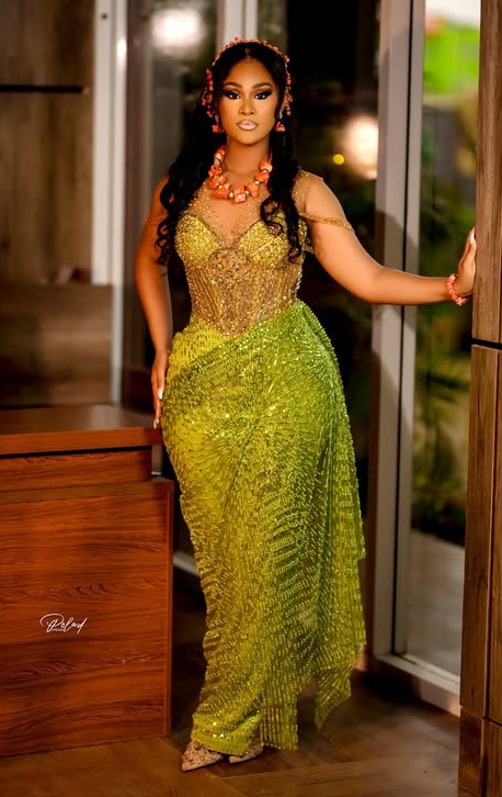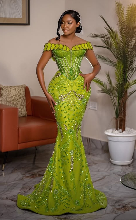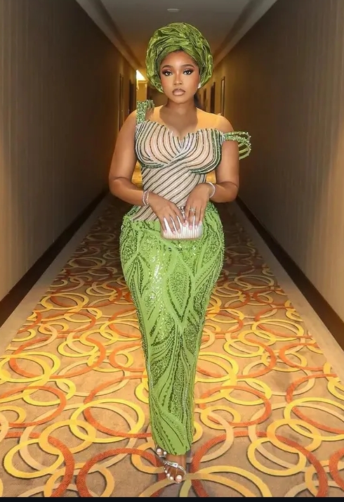 Lemon green is more than just a color; it’s a statement of boldness and vibrancy. It complements a wide range of skin tones and photographs beautifully under natural or indoor lighting. Fashion-forward ladies are embracing this hue with various fabrics like lace, tulle, satin, sequin, and embellished mesh to craft truly iconic Aso-Ebi looks.