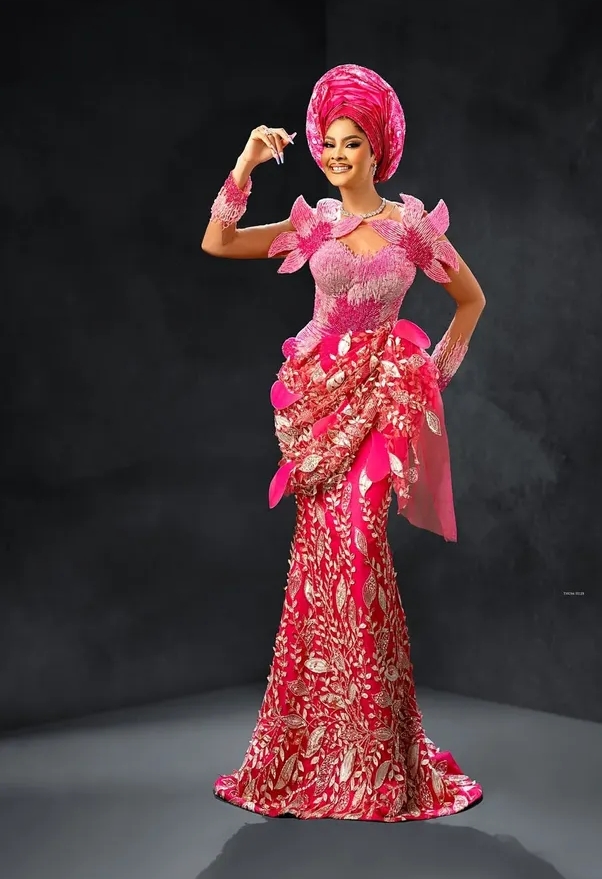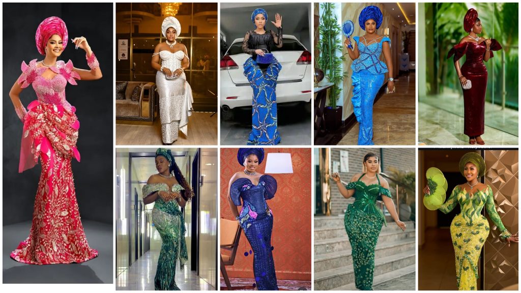 -1. Statement Lace Gowns with Sculpted Details. These styles feature well-defined bodice shaping, stylish shoulder accents, and dramatic waist detailing. The goal is to create a flattering silhouette that stands out effortlessly in a crowd. Paired with a bold headtie and elegant jewelry, this look is perfect for being the “star guest”.