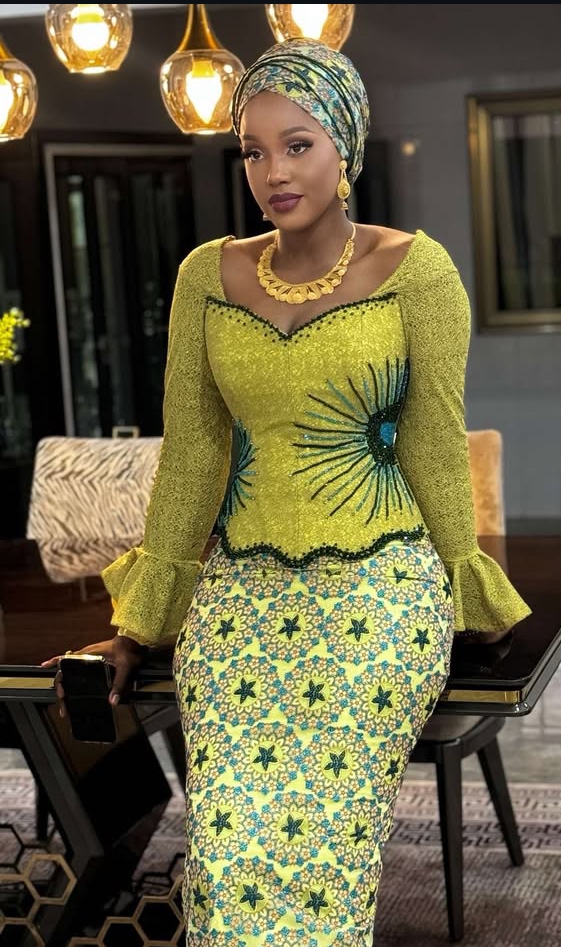 - Yellow-Green Beaded Lace Look – A blend of style and lace with structured sleeve design and subtle corsetry, ideal for wedding guests or classy owambe lovers.